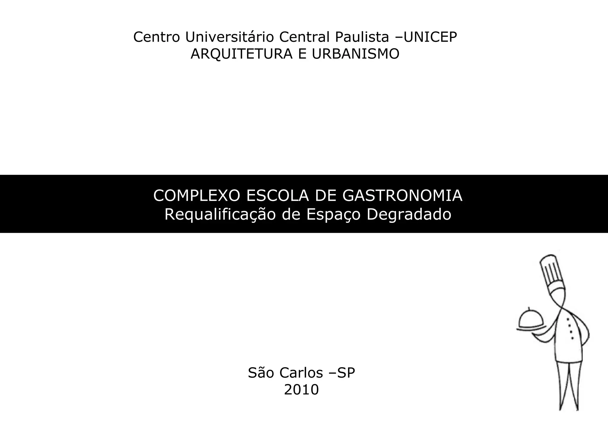 Este documento descreve uma proposta para requalificar uma antiga serralheria degradada em São Carlos, São Paulo, Brasil, transformando-a em um Complexo Escola de Gastronomia. A área escolhida está localizada em uma área mista residencial e comercial próxima a outras instituições de ensino. O projeto pretende restaurar os galpões existentes e construir um novo bloco para abrigar laboratórios, com o objetivo de capacitar profissionais para atender à demanda crescente do mercado de bares, restaurantes e hotelaria