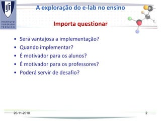 O documento discute a implementação do laboratório virtual e-lab no ensino de ciências, destacando seus potenciais benefícios para motivar alunos e professores através de métodos de ensino mais contextualizados e práticas laboratoriais. O e-lab permite realizar experimentos de forma segura online, alinhado com o currículo nacional. Sua adoção poderia ajudar a reverter a falta de interesse pelas ciências e oferecer desafios adicionais.