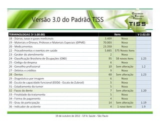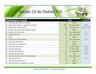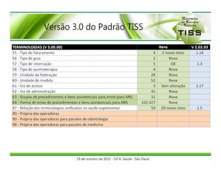 O documento discute o componente de representação de conceitos em saúde do padrão TISS, que estabelece um conjunto de termos para identificar eventos e itens assistenciais da saúde suplementar consolidados na Terminologia Unificada da Saúde Suplementar (TUSS). A ANS é responsável por estabelecer e atualizar a TUSS, enquanto as operadoras podem criar códigos próprios que devem ser solicitados para inclusão na TUSS.