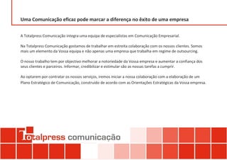 O documento apresenta a agência de comunicação Totalpress, que oferece serviços de consultoria em comunicação externa e interna. Eles desenvolvem planos estratégicos de comunicação para clientes, analisando suas necessidades, objetivos e públicos-alvo. A Totalpress trabalha em estreita colaboração com os clientes e oferece serviços como redação de releases de imprensa, assessoria de imprensa, gestão de mídias sociais e produção de publicações a preços acessíveis.