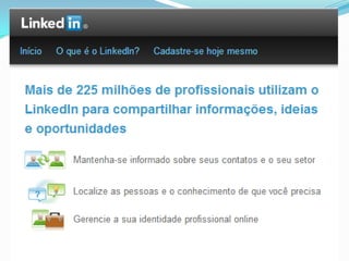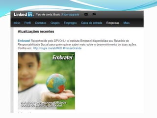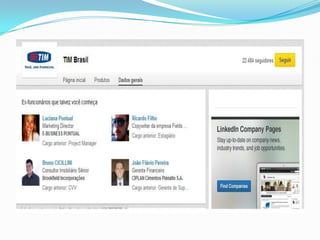 A página de empresa do LinkedIn funciona como um relatório diversificado da empresa dividido em quatro abas: Página inicial, Carreira, Produtos e Serviços e Dados Gerais. O LinkedIn tem um crescimento constante, com aproximadamente duas pessoas por segundo entrando na plataforma, totalizando 172.800 por dia, e o Brasil é o terceiro país com mais inscritos, com 11 milhões de usuários.