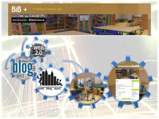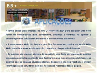 O documento descreve a Web 2.0 como uma nova forma de comunicação na internet que é mais cooperativa e centrada nos usuários, permitindo a interação e criação conjunta de conteúdo. Ele também discute como as bibliotecas escolares podem usar blogs para envolver os alunos e compartilhar recursos de forma colaborativa.