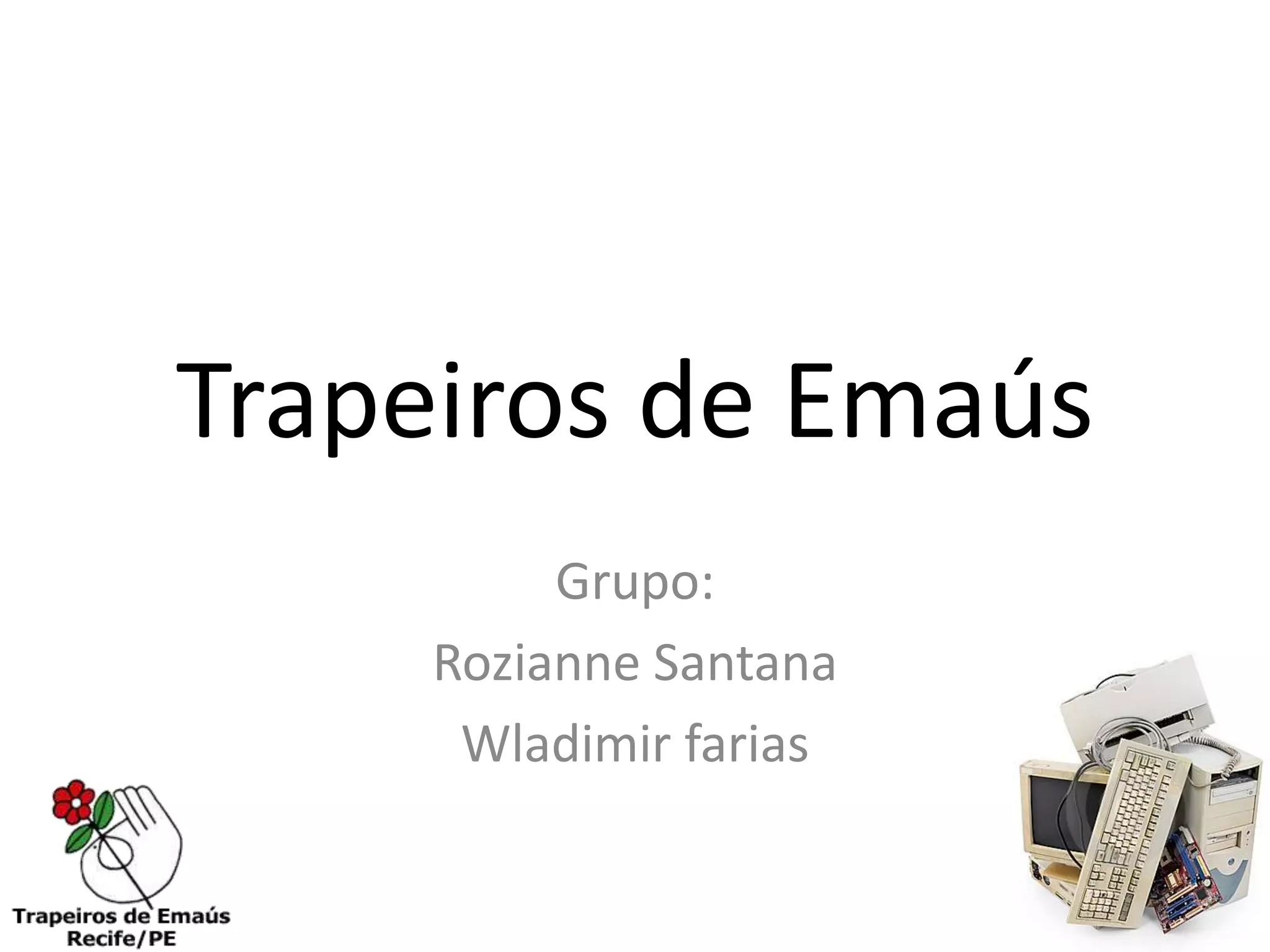 O documento resume a história e as atividades da Associação Trapeiros de Emaús no Brasil. Fundada na França em 1949, chegou ao Recife em 1996 para coletar, reciclar e vender materiais usados, oferecendo cursos profissionalizantes e bazares populares para ajudar pessoas carentes, sempre baseada nos princípios de acolhida, trabalho, partilha e serviço à comunidade.