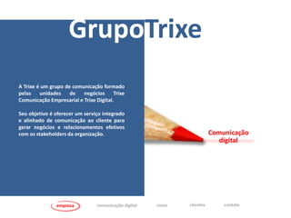 O documento descreve a Trixe, um grupo de comunicação formado pelas unidades Trixe Comunicação Empresarial e Trixe Digital. A Trixe Digital oferece soluções de comunicação digital para gerar negócios e relacionamentos efetivos entre empresas e seus públicos de interesse.