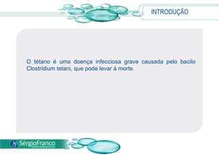 O tétano é uma doença grave causada pela bactéria Clostridium tetani que entra no corpo por ferimentos, causando espasmos musculares dolorosos e potencialmente fatais. Os sintomas incluem rigidez da mandíbula e dos músculos do pescoço e costas. A vacinação é a melhor forma de prevenção.