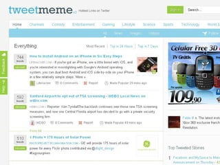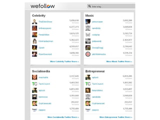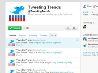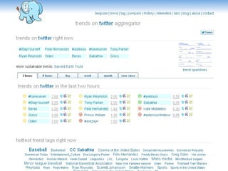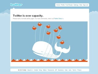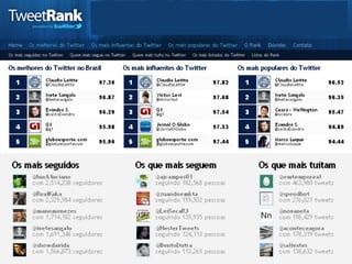 O Twitter é uma rede social e microblogging que permite o envio de mensagens de até 140 caracteres, surgindo em 2006 como uma ideia de Jack Dorsey e Evan Williams. A plataforma se destaca por sua simplicidade, adaptabilidade e pela capacidade dos usuários de moldar suas convenções e ferramentas. Em 2009, tornou-se a terceira rede social mais popular, com mais de 55 milhões de visitas mensais e um crescimento contínuo, estabelecendo parcerias com Google e Microsoft para integração de seus dados.
