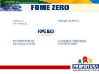 Este documento descreve as ações de segurança alimentar e nutricional realizadas em Ubá, MG. Apresenta o histórico do Conselho Municipal de Segurança Alimentar, a criação do Banco de Alimentos em 2007, e programas como o PAA iniciado em 2008. Também detalha a estrutura da Seção de Segurança Alimentar e Nutricional, seus programas e parcerias, beneficiando mais de 3 mil pessoas por mês.