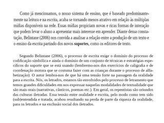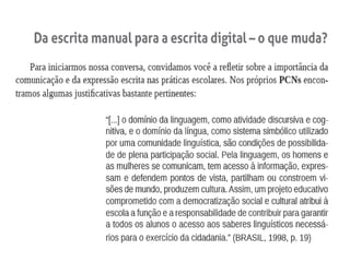 O documento propõe uma reflexão sobre os ganhos e perdas da leitura e escrita digital na escola. Ele solicita que se escolha um ganho e uma perda, e deem sugestões para minimizar a perda e potencializar os ganhos. O documento instrui a salvar o trabalho após digitar as ideias livremente.