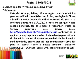 A pauta de 22/06/2013 discute a leitura deleite, informes sobre presença e avaliações, apresentação dos objetivos da Unidade 2, vídeo sobre alfabetização e letramento, discussão sobre planejamento do ensino da Língua Portuguesa, avaliação do encontro e tarefas. A pauta de 29/06/2013 inclui leitura deleite, retomada das tarefas, análise de materiais didáticos, quadro de rotina e planejamento do uso de materiais do MEC.