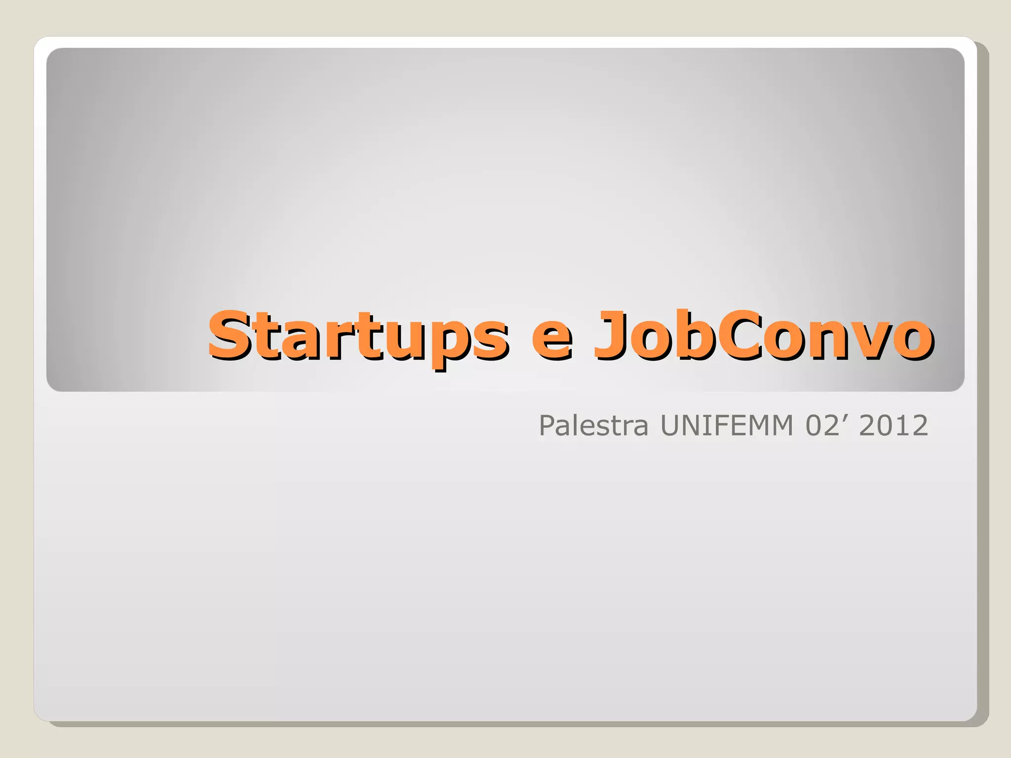 A palestra discute startups e o site JobConvo.com/html5, que permite candidatos gravarem entrevistas e recrutadores avaliarem e compartilharem. Também aborda modelos de negócios como Business Model Canvas e Pivot, incubadoras, validação de ideias, fundos de investimento e escolas que matam a criatividade.