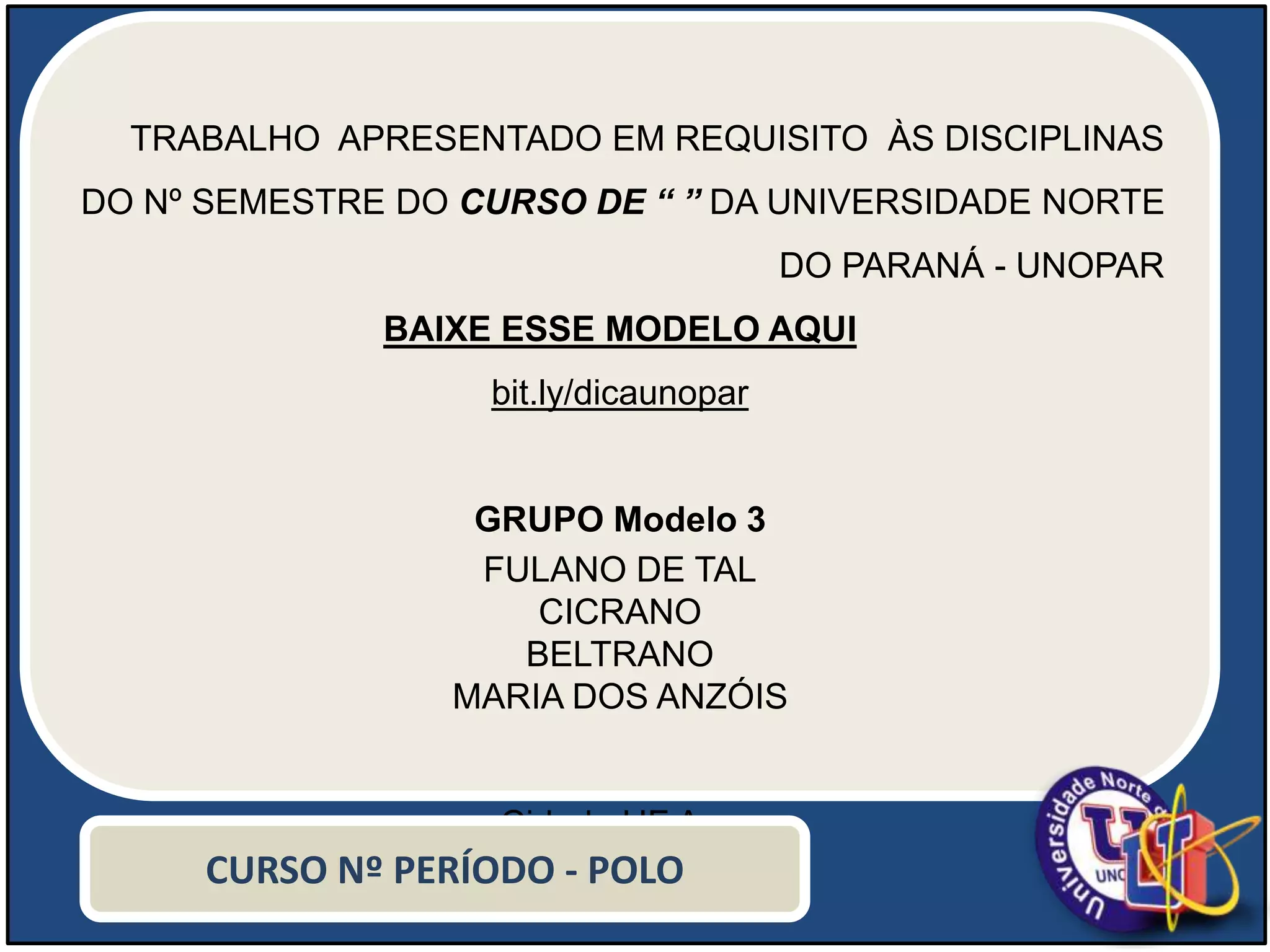 O documento é um modelo de trabalho acadêmico destinado a alunos do curso da universidade norte do paraná (UNOPAR), apresentando orientações sobre formatação e estrutura, incluindo introdução, desenvolvimentos, exercícios práticos, conclusão e referências. Ele destaca a relevância de seguir o padrão tipográfico e disponibiliza links para recursos adicionais. O modelo visa facilitar a elaboração de trabalhos acadêmicos em grupo.