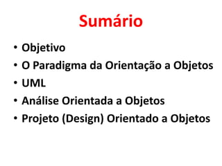 O documento discute conceitos de análise e projeto orientados a objetos, incluindo identificação de classes, herança, encapsulamento, polimorfismo, UML e projeto orientado a objetos visando baixo acoplamento e alta coesão.