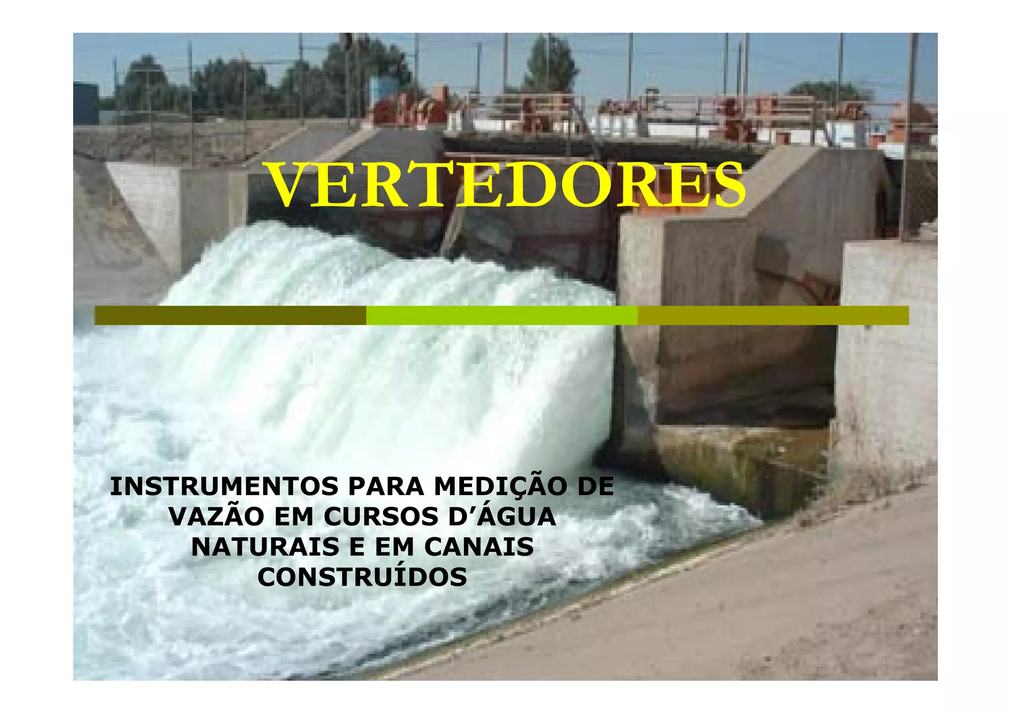 Vertedores são instrumentos utilizados para medir vazão em cursos d'água e canais. Podem ser classificados de acordo com sua forma, tipo de soleira e largura relativa. A vazão é calculada usando fórmulas que levam em conta esses fatores e a altura da água. Vertedores retangulares sem contrações laterais usam a fórmula de Francis.