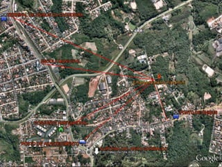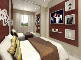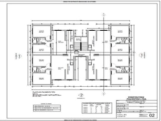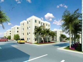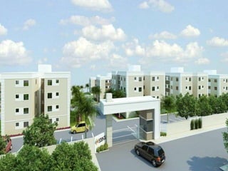 O documento descreve um empreendimento imobiliário composto por três condomínios com um total de 21 blocos de quatro andares e quatro apartamentos por andar, sendo cinco blocos com apartamentos de três quartos e dezesseis blocos com apartamentos de dois quartos, além de guarita, estacionamento descoberto, muros, quadra poliesportiva descoberta e playground. O documento também fornece detalhes sobre os materiais de acabamento dos compartimentos dos apartamentos.