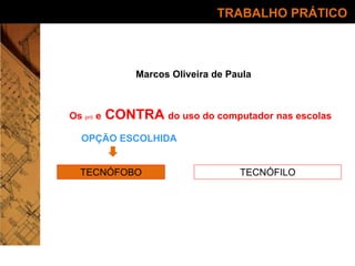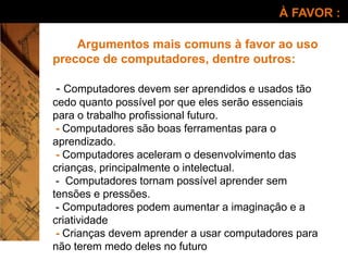 O documento discute os prós e contras do uso de computadores na educação de crianças. Apresenta argumentos de que computadores podem acelerar o desenvolvimento intelectual das crianças, mas também podem prejudicar seu desenvolvimento psicológico ao forçá-las a amadurecer rápido demais. No final, conclui que crianças devem ser crianças e que o uso precoce de computadores pode causar problemas psicológicos no futuro.