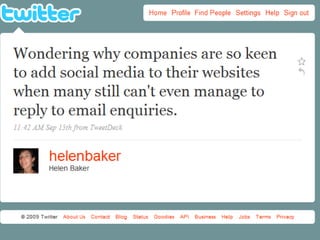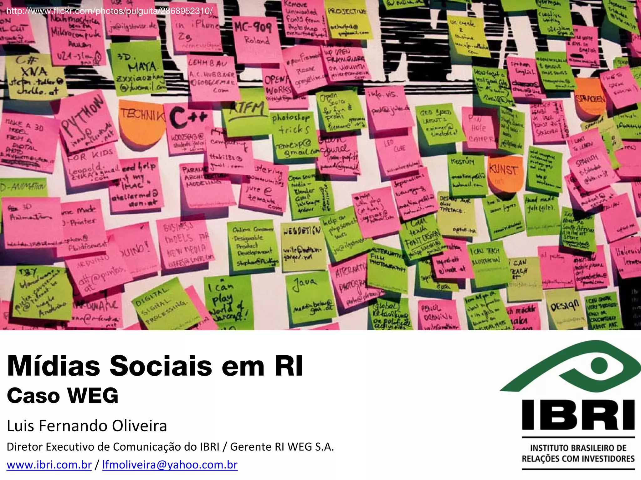 O documento discute o uso de mídias sociais pela empresa brasileira WEG para relações com investidores. Ele descreve brevemente a WEG e suas operações globais, introduz o conceito de mídias sociais, e apresenta como a WEG usa plataformas como Twitter, Issuu e SlideShare para se comunicar com investidores. O documento também cita pesquisas mostrando o crescimento do uso de redes sociais e o tempo gasto nelas.