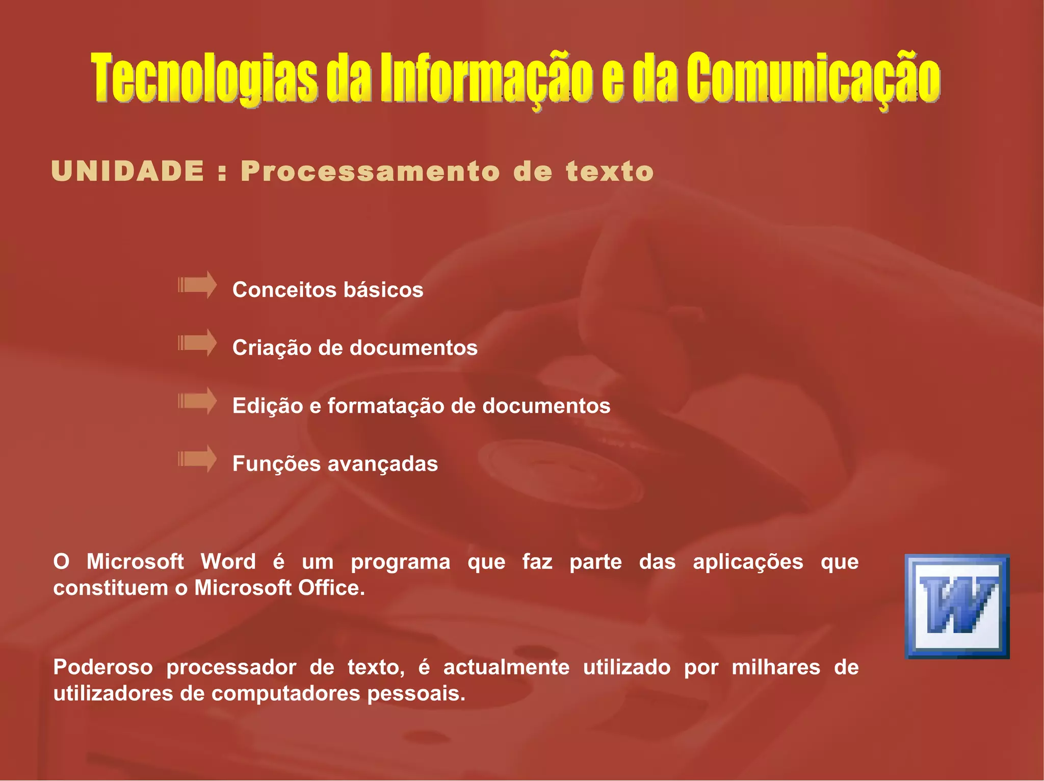 UNIDADE : Processamentode texto Criação de documentos Edição e formatação de documentos Funções avançadas Conceitos básicos O Microsoft Word é um programa que faz parte das aplicações que constituem o Microsoft Office. Poderoso processador de texto, é actualmente utilizado por milhares de utilizadores de computadores pessoais. Tecnologias da Informação e da Comunicação