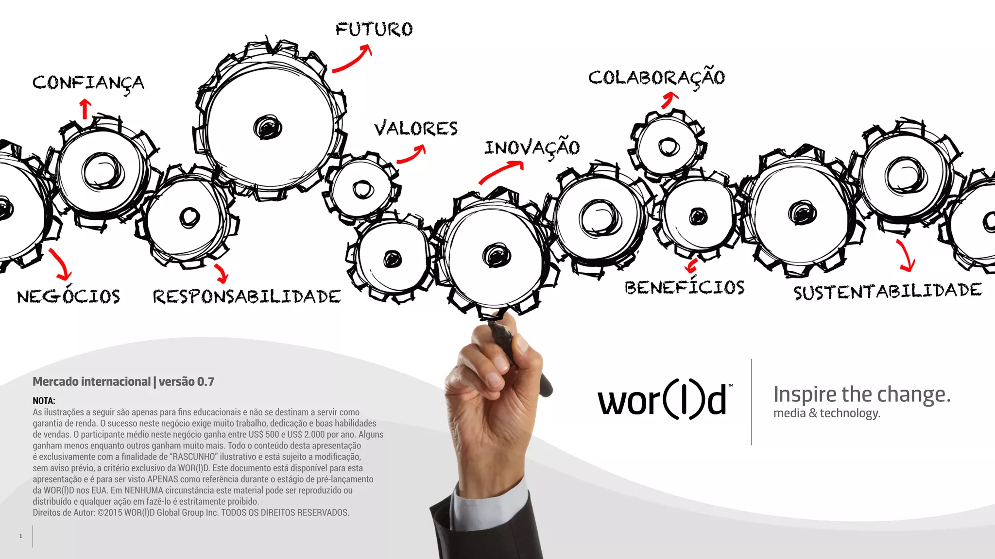 O documento apresenta a wor(l)d Media & Technology, destacando suas operações globais em mais de 100 países e seu foco em venda direta, energia renovável e inovações tecnológicas. Também menciona os ganhos médios de participantes no negócio e promove o projeto Power Clouds, que permite a aluguel de painéis solares. Além disso, detalha a liderança do CEO Fabio Galdi e a missão de melhorar a qualidade de vida através de soluções inovadoras.