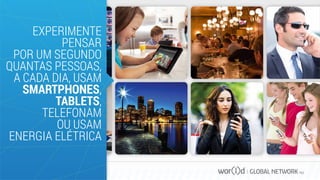 O documento promove os serviços e produtos de uma empresa de marketing multinível chamada Global Network PLC, descrevendo suas áreas de negócios em tecnologia móvel, telecomunicações, energia renovável e anunciando seus planos de pagamento altamente lucrativos.