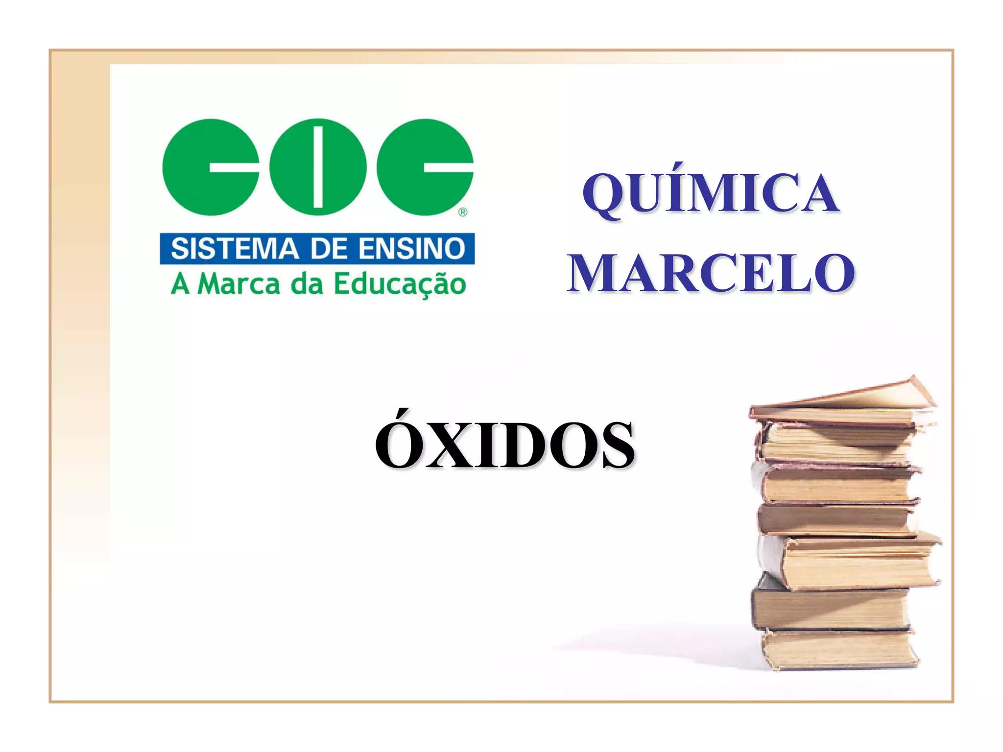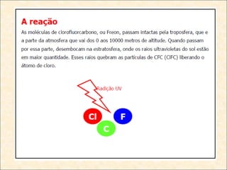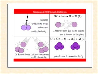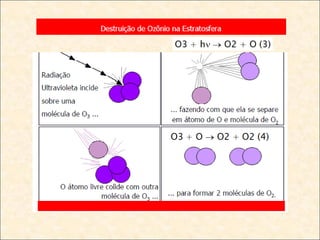 [1] O documento discute os tipos de óxidos, incluindo óxidos ácidos, básicos, anfóteros e neutros, e como eles reagem com água e ácidos/bases. [2] Também aborda aplicações cotidianas de óxidos como o efeito estufa, chuva ácida e poluição do ar. [3] Por fim, explica a formação e importância da camada de ozônio e os danos causados pelos clorofluorcarbonos.