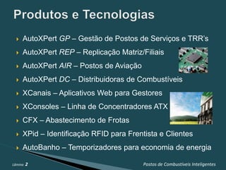 O documento descreve um software de gestão para postos de combustíveis chamado AutoXPert, que oferece módulos para gestão de postos, replicação entre filiais, postos de aviação, distribuidoras de combustíveis e aplicativos web. O software permite gestão completa de postos e lojas de conveniência de forma inteligente e integrada.