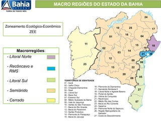 O documento apresenta as macro regiões e territórios de identidade do Estado da Bahia, destacando suas características demográficas e econômicas. Também descreve projetos de desenvolvimento como o Plano da Bahia de Todos os Santos, o Estaleiro Enseada do Paraguaçu e a Ferrovia de Integração Oeste-Leste.