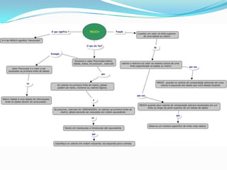 A função PROCH no Excel procura um valor em uma linha superior de uma tabela e retorna um valor na mesma coluna de uma linha especificada. O documento explica como usar a função PROCH para vincular células em uma tabela de dados e atualizar automaticamente os resultados quando os valores de entrada são modificados.