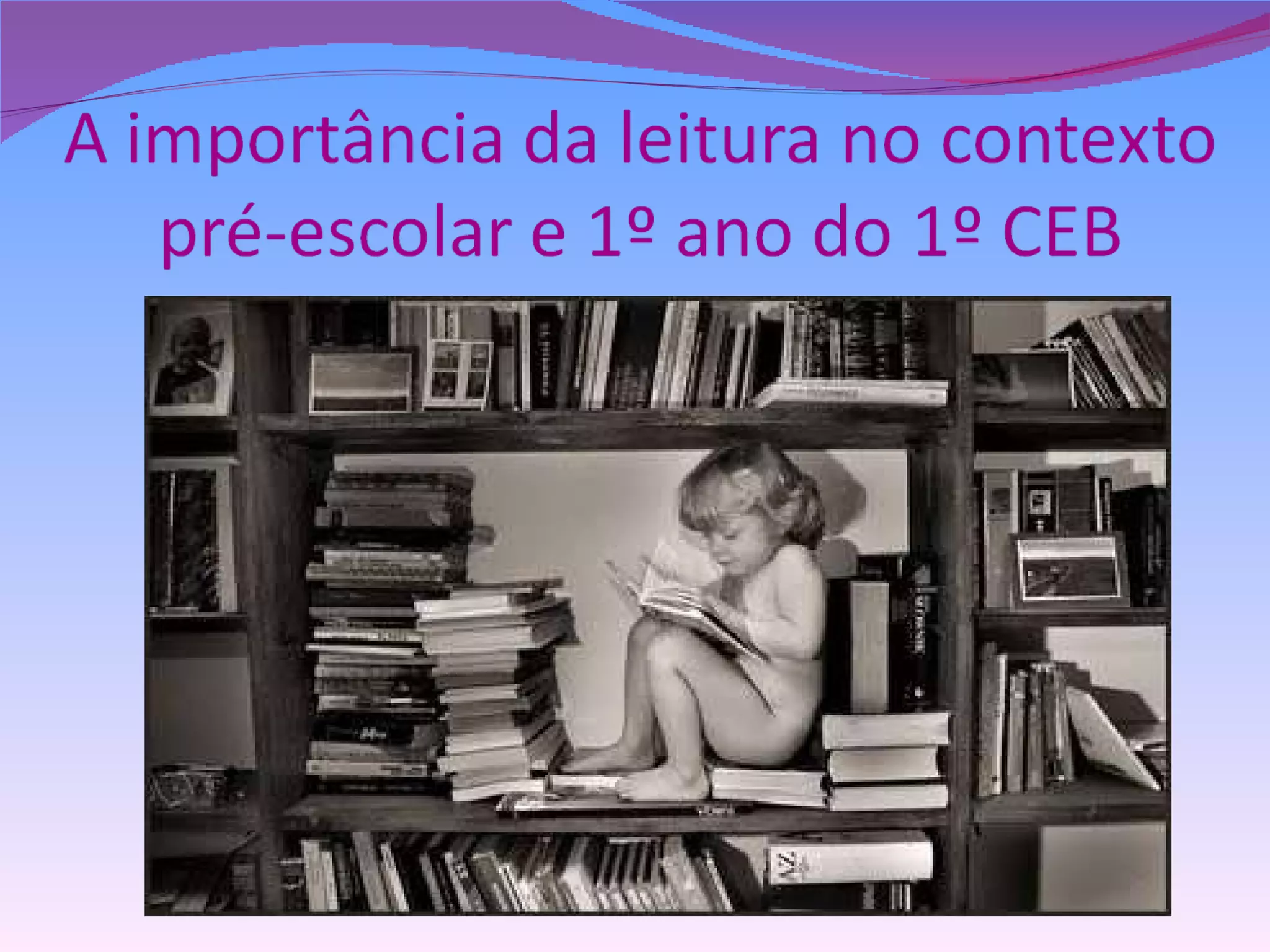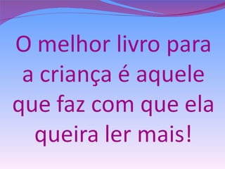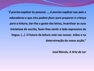 O documento discute os benefícios da leitura para o desenvolvimento das crianças, incluindo melhorar a imaginação, memória, vocabulário e habilidades de escrita. Também descreve dois métodos de ensino da leitura, sintético e analítico, e o papel da escola e da família em promover a literacia.