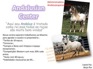 Este centro eqüestre oferece tratamento real para cavalos andaluzes, mas dá boas-vindas a todas as raças. Ele trabalha duro para agradar cavalos e proprietários, oferecendo tarifas competitivas, alimentação, limpeza de estábulos, competições western com descontos e aulas para até 40 cavalos, independentemente do nível de habilidade do cavaleiro.