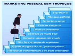 Marketing pessoal envolve planejamento, autoconhecimento e desenvolvimento pessoal e profissional. É importante definir valores, visão, missão e entender os próprios pontos fortes e fracos. Um bom marketing pessoal transmite confiança através da comunicação efetiva.