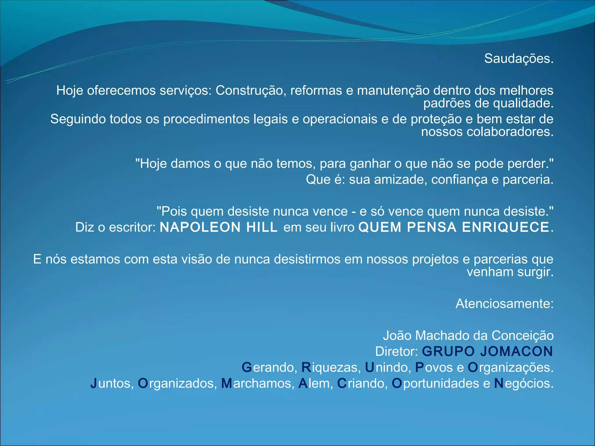 O documento apresenta os serviços de construção, reforma e manutenção de uma empresa, destacando seu compromisso com a qualidade, procedimentos legais e bem-estar dos funcionários. A empresa busca parcerias duradouras baseadas na amizade, confiança e visão de nunca desistir dos projetos, citando o escritor Napoleon Hill.