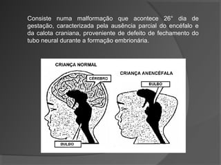 A anencefalia é uma malformação congênita grave caracterizada pela ausência parcial do encéfalo e da calota craniana, proveniente de defeito de fechamento do tubo neural durante a formação embrionária. É uma patologia letal com expectativa de vida muito curta para os bebês, embora o tempo exato seja incerto. Pode ser diagnosticada por ultra-sonografia a partir da 12a semana de gestação.