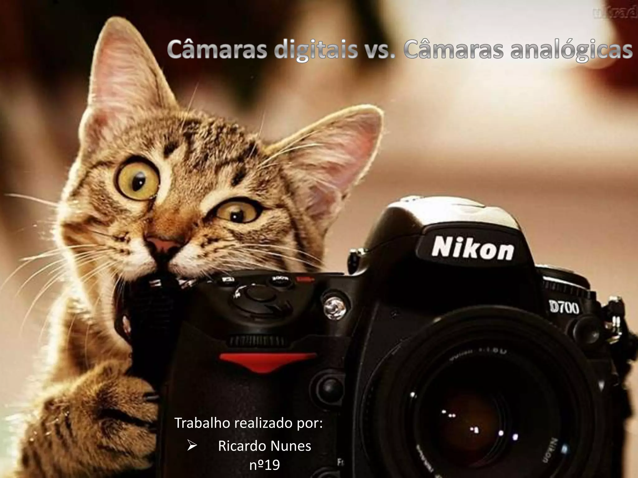 Este documento descreve as características e diferenças entre câmeras digitais e analógicas. As câmeras digitais armazenam imagens eletronicamente em cartões de memória em vez de usar filme, permitem visualizar e apagar fotos imediatamente, e têm menor custo de produção de cópias. No entanto, câmeras analógicas podem produzir imagens de maior resolução e durabilidade.