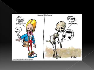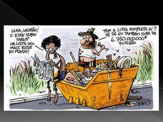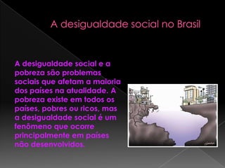 O documento discute a desigualdade social no Brasil, descrevendo como ela se desenvolveu ao longo da história do país, desde os tempos coloniais até a atualidade, perdurando mesmo com o crescimento econômico. Relata que o Brasil tem um dos piores índices de desigualdade no mundo devido a fatores históricos como a exploração de recursos naturais e mão de obra barata que beneficiaram poucos grupos ao longo do tempo.