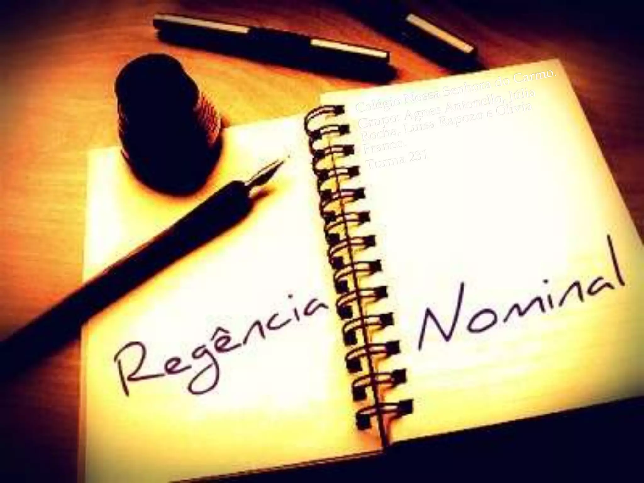Regência nominal refere-se à relação entre um nome e termos regidos por ele, intermediados por preposições. Exemplos mostram como substantivos e adjetivos regem complementos introduzidos por preposições como "a", "de", "em", entre outras. O texto lista vários nomes e suas respectivas preposições regidas.