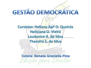 O documento discute os princípios da gestão democrática na educação brasileira, incluindo a participação de professores, funcionários, pais e alunos no processo de tomada de decisão nas escolas por meio de conselhos e eleições. A gestão democrática busca democratizar a administração escolar e melhorar os resultados educacionais.