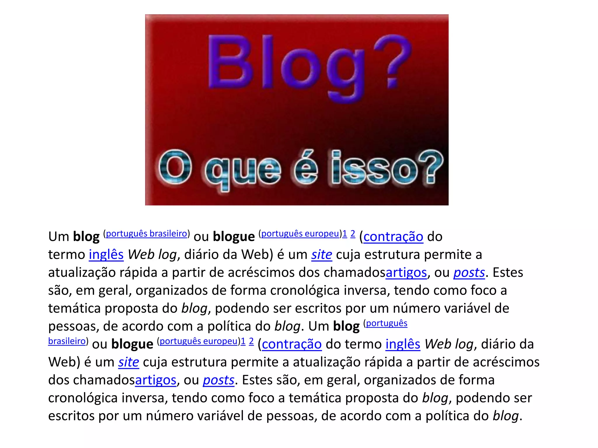 1) Blogs são sites onde pessoas podem publicar artigos ou posts de forma cronológica inversa sobre um determinado tema. 2) Em 1997, Jorn Barger criou o termo "weblog" para descrever páginas onde pessoas compartilham links interessantes. 3) Atualmente existem cerca de 70 milhões de blogs, que evoluíram de diários pessoais para sites com notícias e conteúdos sobre diversos assuntos.