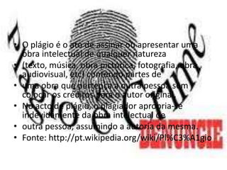 O plágio é o ato de copiar ou assinar uma obra intelectual de outra pessoa e dizer que é sua, sem dar os créditos ao autor original. Isso inclui textos, músicas, fotos e outros trabalhos. O plágio é considerado antiético e até crime em muitos países.