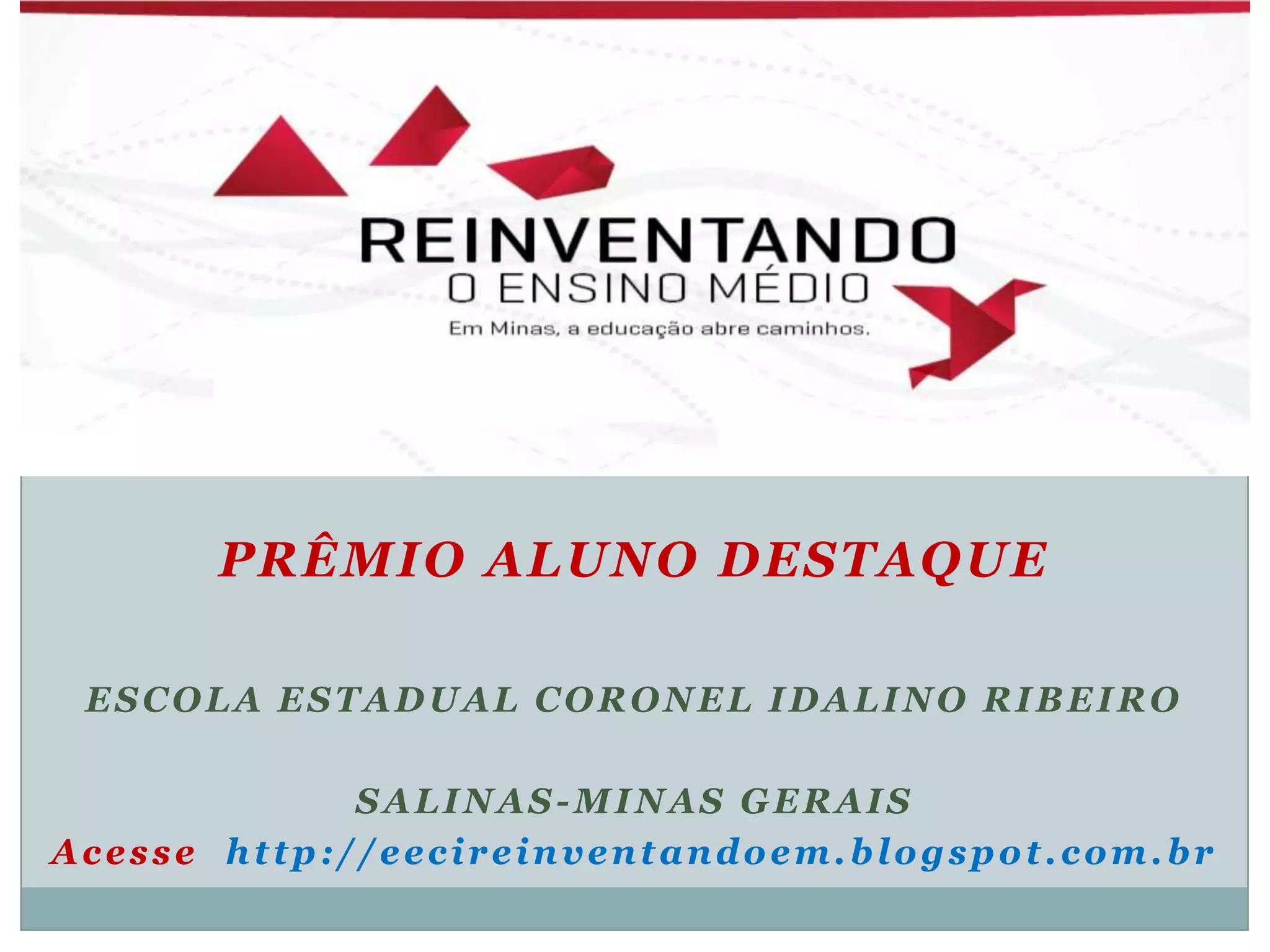 O documento descreve o Prêmio Aluno Destaque da Escola Estadual Coronel Idalino Ribeiro, que tem como objetivo valorizar o bom desempenho acadêmico dos alunos. A escola desenvolve trabalhos para motivar os alunos a obterem boas notas por meio do interesse e dedicação aos estudos. O prêmio reconhece os alunos com melhor desempenho no 1o bimestre de 2013 em todas as séries, incluindo sete alunos especificamente mencionados.