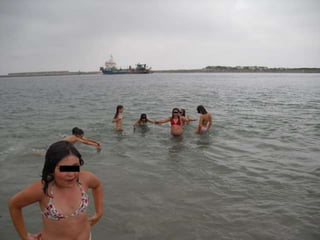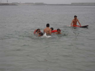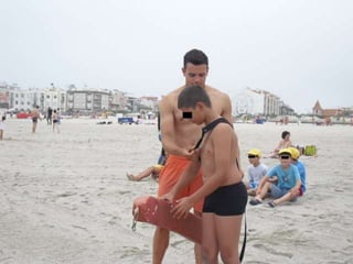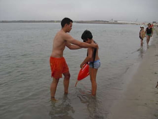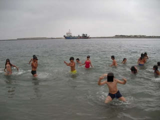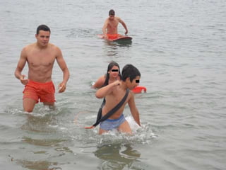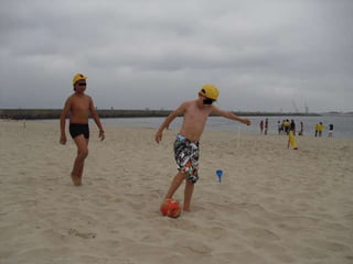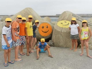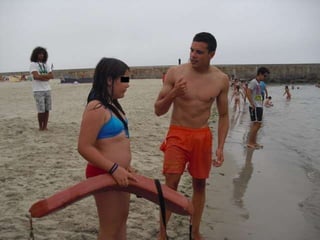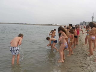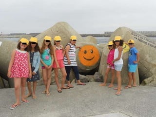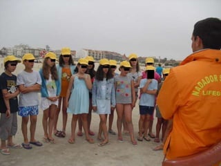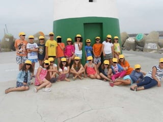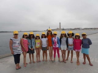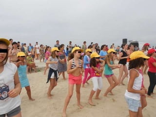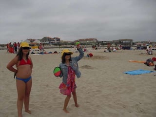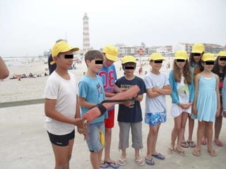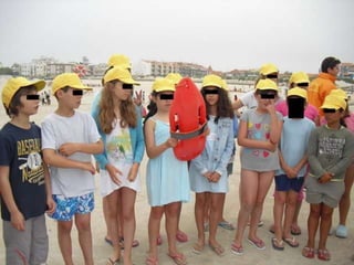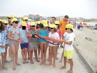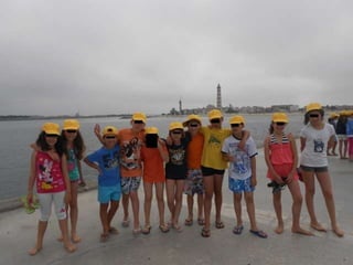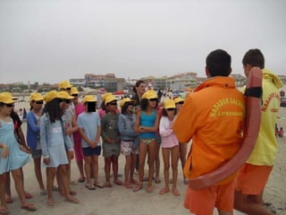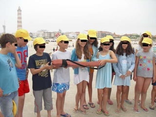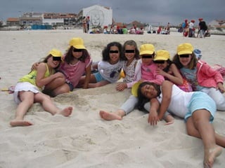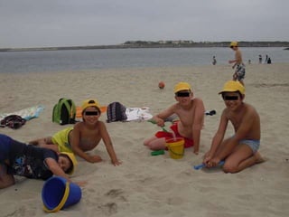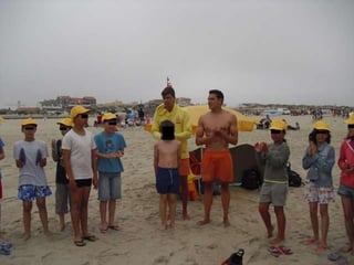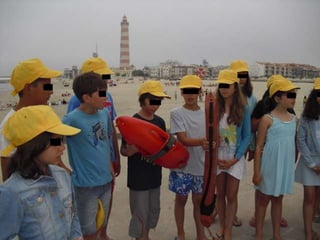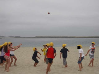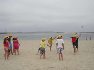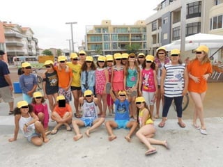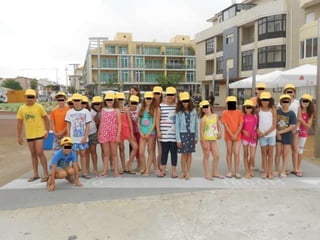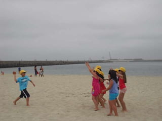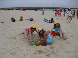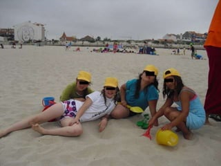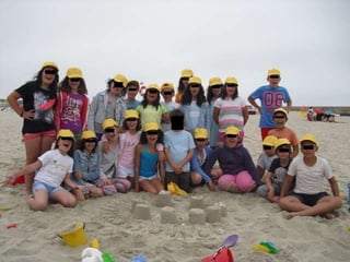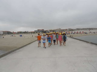 O grupo "chapéus amarelos" brincou na praia com jogos, construção de bolos de areia e aprendizado de salvamento. Eles celebraram o aniversário do João Prata e desfrutaram de um banho de mar e areia antes de comerem juntos.