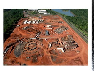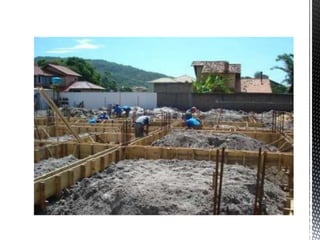 O documento discute o projeto de um canteiro de obras, incluindo a localização de áreas administrativas, de produção e armazenamento de materiais. Ele destaca a importância de planejar o fluxo físico entre setores para eficiência e de seguir normas de segurança como a NR-18.