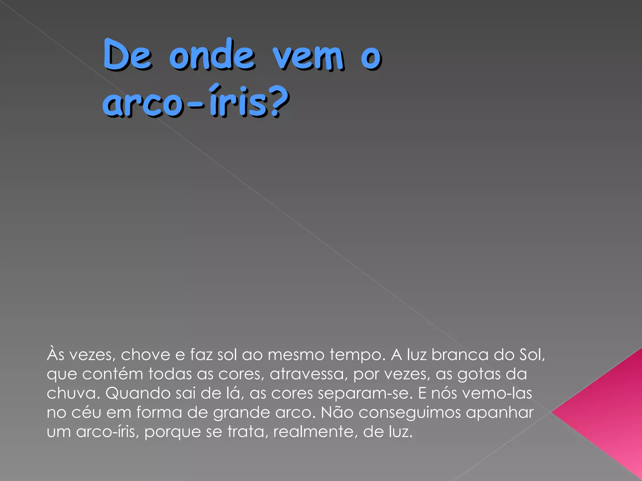 O arco-íris surge quando a luz do sol atravessa gotas de chuva, separando as cores. Ele só pode ser visto quando chove e faz sol ao mesmo tempo, desaparecendo rapidamente quando a chuva para, já que as gotas de água são necessárias para refletir a luz.