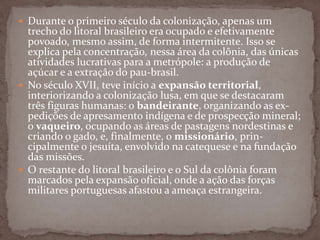 O documento descreve a expansão territorial da colonização portuguesa no Brasil entre os séculos XVI e XVIII através da atuação de bandeirantes, vaqueiros e missionários, e a conquista das regiões do litoral nordestino ameaçadas por franceses, ingleses e holandeses. Também aborda a ocupação de territórios como Amazônia, Rio Grande do Sul, Santa Catarina e o desenvolvimento da pecuária em diversas regiões como fator importante para a ocupação do interior do país.