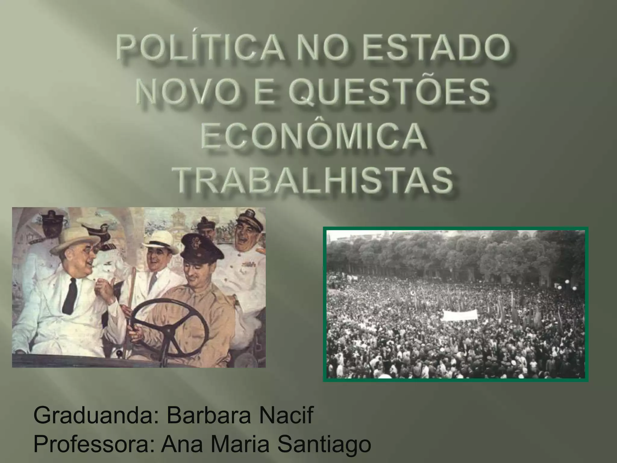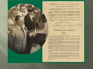 O documento descreve aspectos da era Vargas no Brasil, incluindo a Constituição de 1934, a Consolidação das Leis do Trabalho de 1943, e fotos de comícios e eventos públicos durante o governo Vargas, como o Dia do Trabalhador.