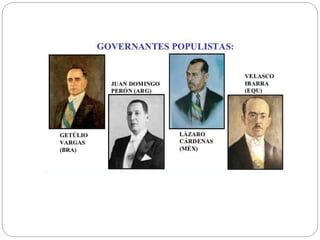 Líderes populistas como Lázaro Cárdenas, Juán Perón e Getúlio Vargas governaram o México, Argentina e Brasil nos anos 1930-1950 promovendo reformas sociais. Neste período também ocorreram a Revolução Cubana que levou Fidel Castro ao poder e um aumento das ditaduras militares na América Latina.