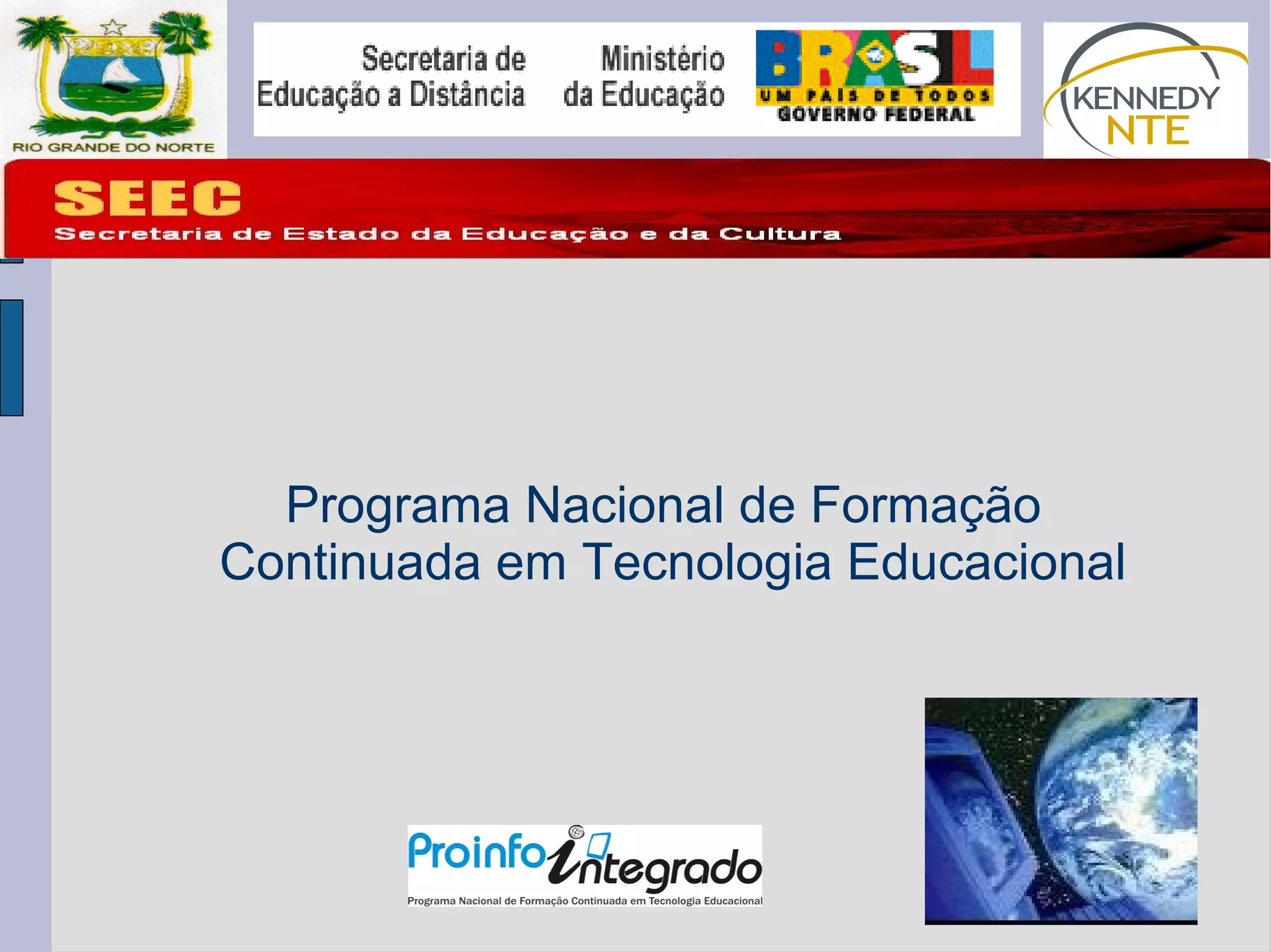 Este documento descreve um programa de formação continuada para professores sobre tecnologia educacional com 100 horas de carga horária, divididas entre momentos presenciais e a distância. O curso objetiva oferecer subsídios teórico-práticos sobre o uso de TIC no ensino e aprendizagem, e é composto por 4 unidades abordando diferentes temas como internet e mídias digitais.