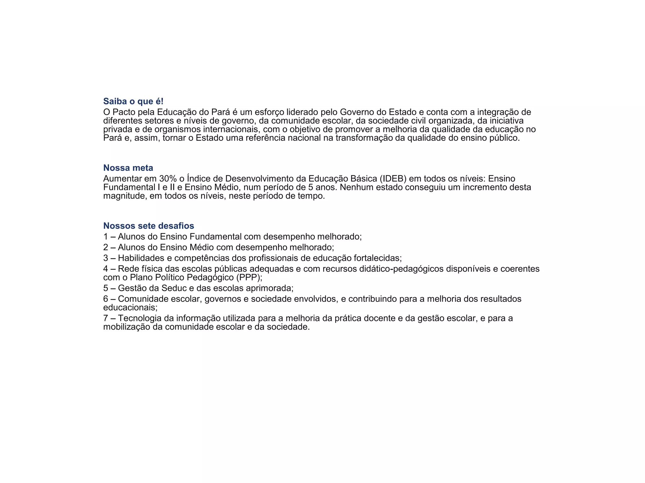 O Pacto pela Educação do Pará é um esforço liderado pelo governo estadual com o objetivo de promover a melhoria da qualidade da educação no estado. Sua meta é aumentar o IDEB em 30% em todos os níveis de ensino em 5 anos. Seus sete desafios incluem melhorar o desempenho dos alunos, fortalecer as habilidades dos professores e adequar as escolas com recursos pedagógicos.
