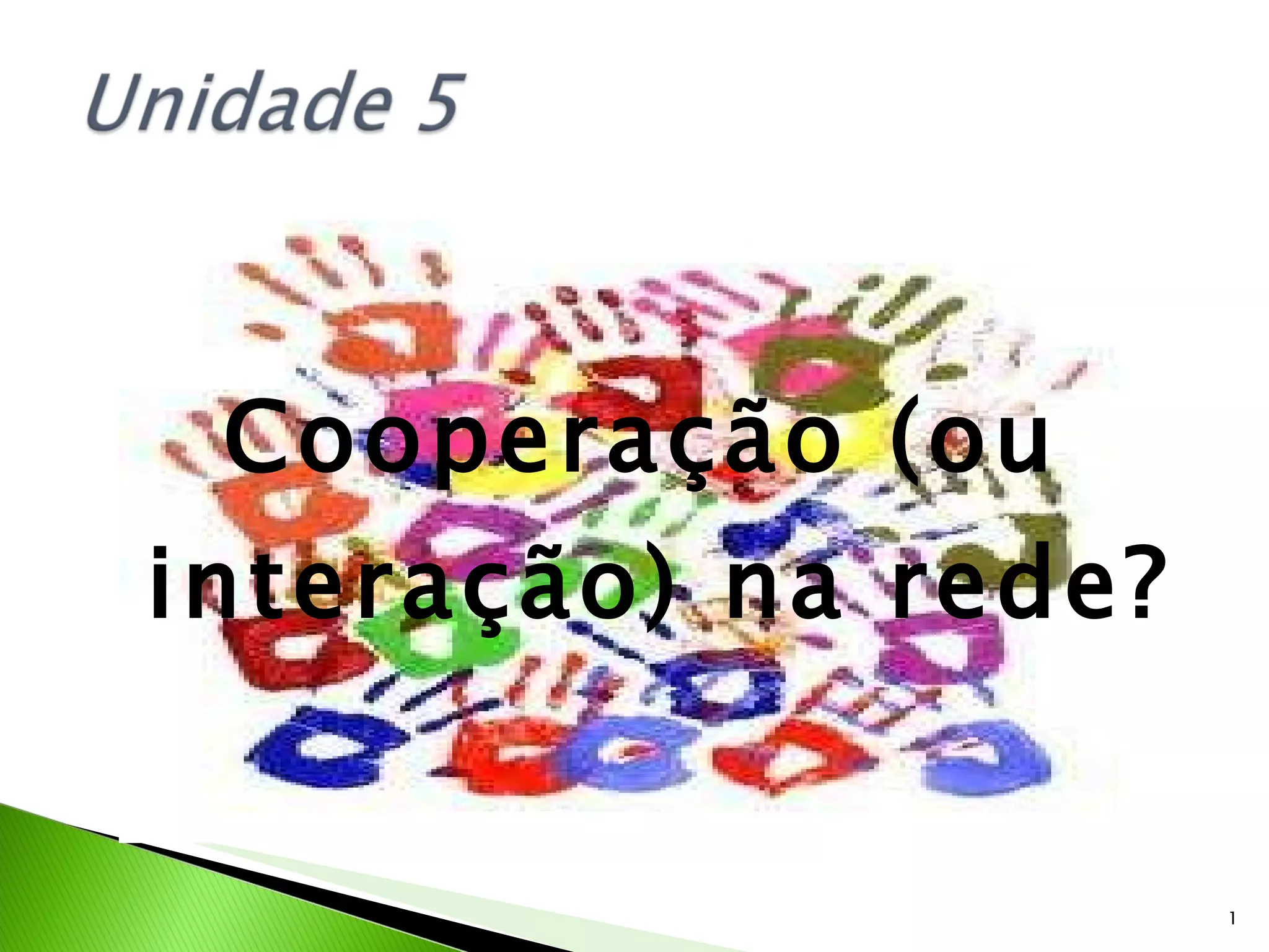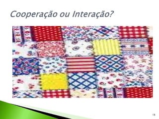O documento discute a importância da cooperação e interação na internet para a sociedade e educação. Ele enfatiza que redes digitais podem promover processos cooperativos de aprendizagem e que ferramentas como wikis e YouTube têm potencial para construir novas práticas pedagógicas. Também reflete que o computador pode substituir aspectos repetitivos da educação, permitindo que professores foquem em atividades mais colaborativas.