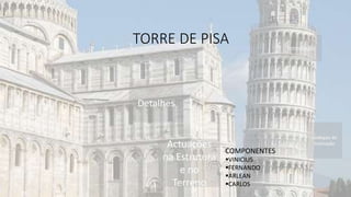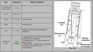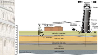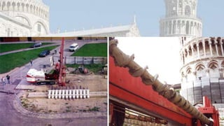 A Torre de Pisa foi construída sobre terreno instável ao longo de 200 anos, o que causou sua inclinação progressiva. Diversas intervenções ao longo dos séculos, como a adição de contrapesos de chumbo e a remoção seletiva de solo, conseguiram reduzir sua inclinação em cerca de 1,8 graus e estabilizar a estrutura.