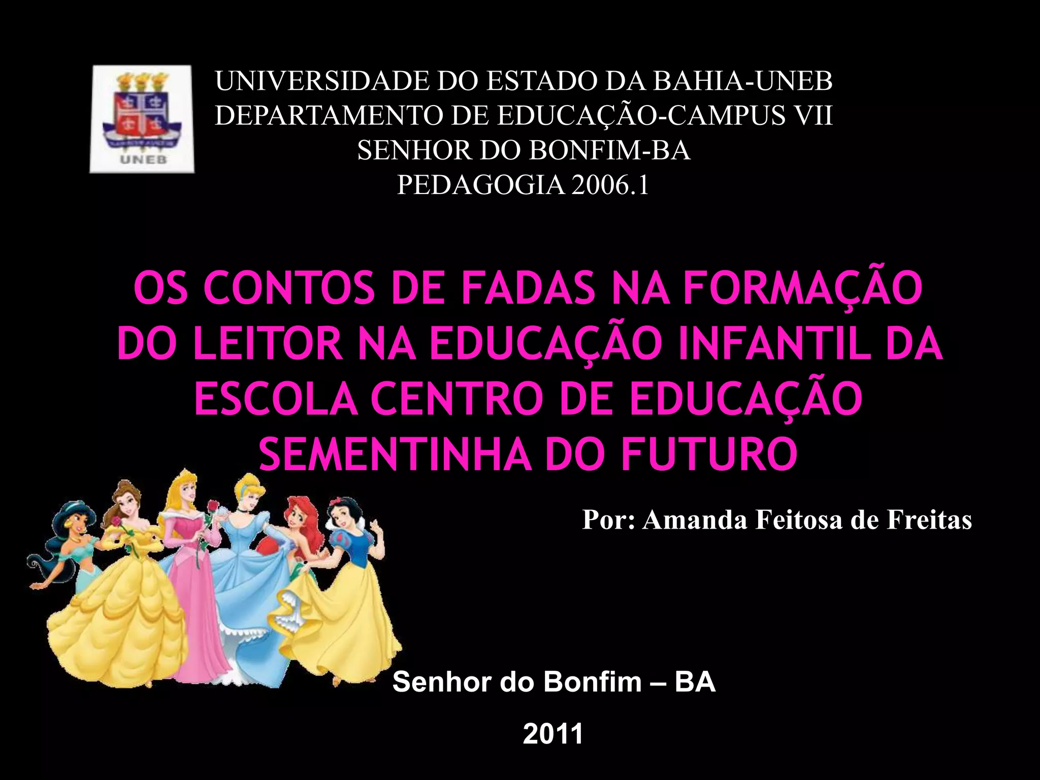 Este documento discute o uso de contos de fadas na formação de leitores na educação infantil. Ele apresenta que os professores da Escola Centro de Educação Sementinha do Futuro usam contos de fadas como ferramenta pedagógica e reconhecem sua importância para incentivar o gosto pela leitura em crianças. A pesquisa qualitativa observou que as professoras contam histórias de diferentes formas para atrair a atenção das crianças e despertar seu interesse pelos livros.